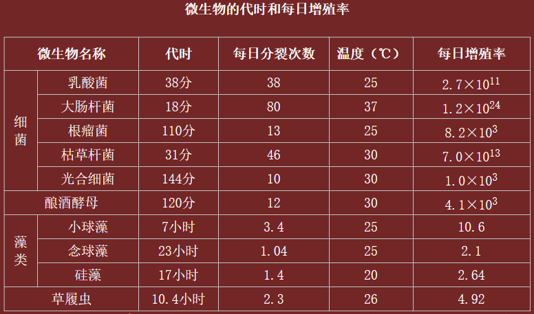 微生物以惊人的速度“生儿育女”。例如大肠杆菌在合适的生长条件下,12.5-20分钟便可繁殖一代,每小时可分裂3次,由1个变成8个。每昼夜可繁殖72代,由1个细菌变成4722366500万亿个(重约4722吨);经48小时后,则可产生2.2×1043个后代,如此多的细菌的重量约等于4000个地球之重。下面的表格列出了几种微生物的代时(分裂1次所需的时间)和每日增殖率。