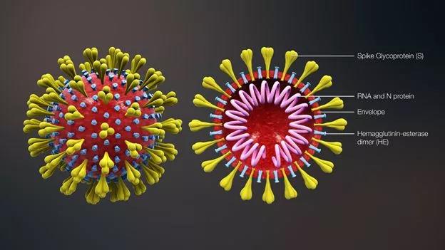 3D合成的冠状病毒外形以及横截面图 (照片来源 Wikipedia)