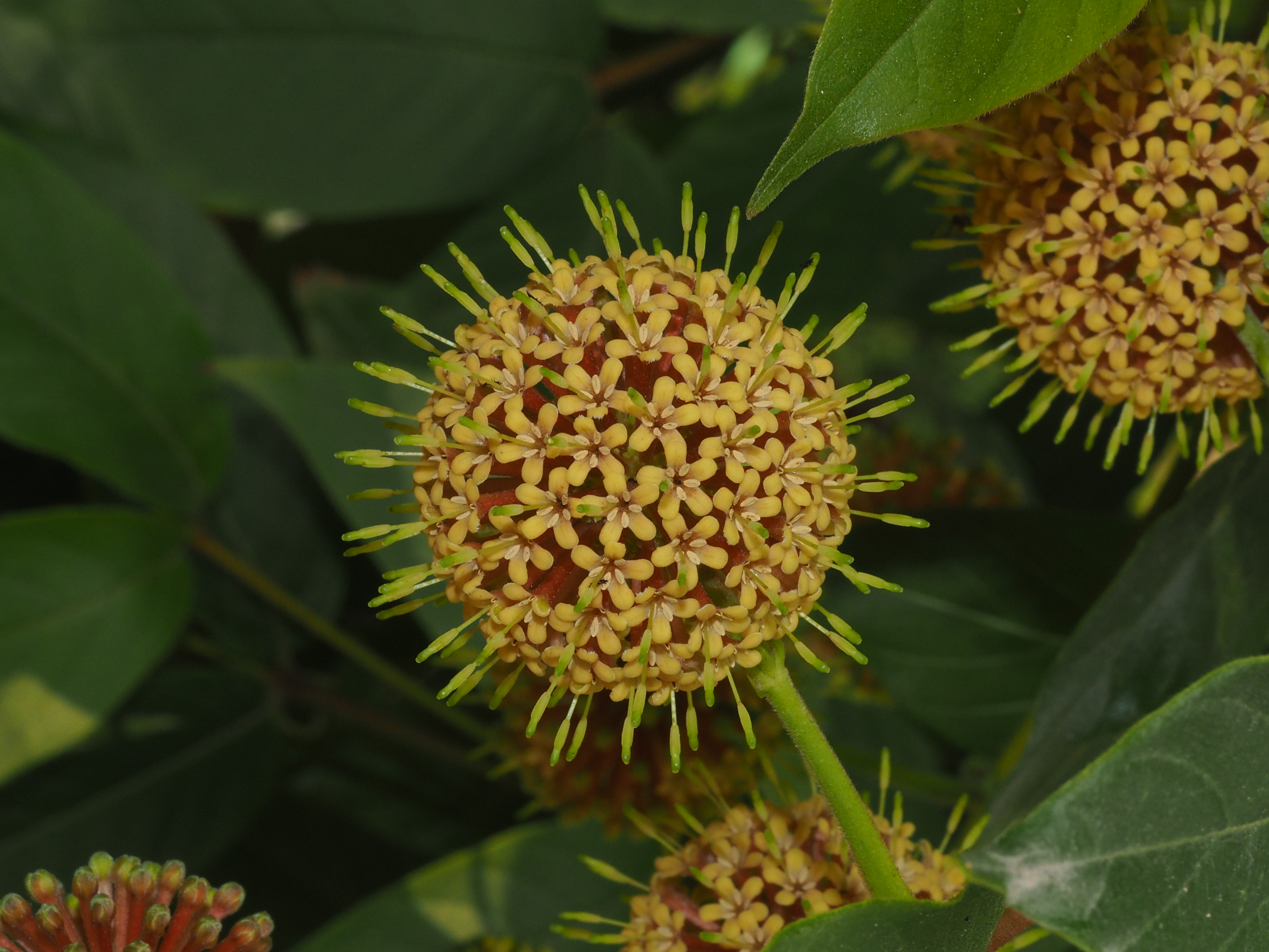 水团花有着另一个名字,叫水杨梅,这也体现出它的花和果实像是杨梅的样子,长成了一个球。它的花柱长长地伸出花冠,像是长出了一根根细小的天线。