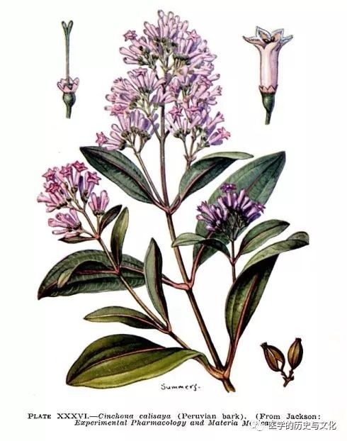 金鸡纳树Cinchona calisaya,茜草科乔木,茎皮和根皮为提制奎宁 (quinine) 的主要原料,用于治疗疟疾,并有镇痛解热及局部麻醉的功用。(图片来自网络)
