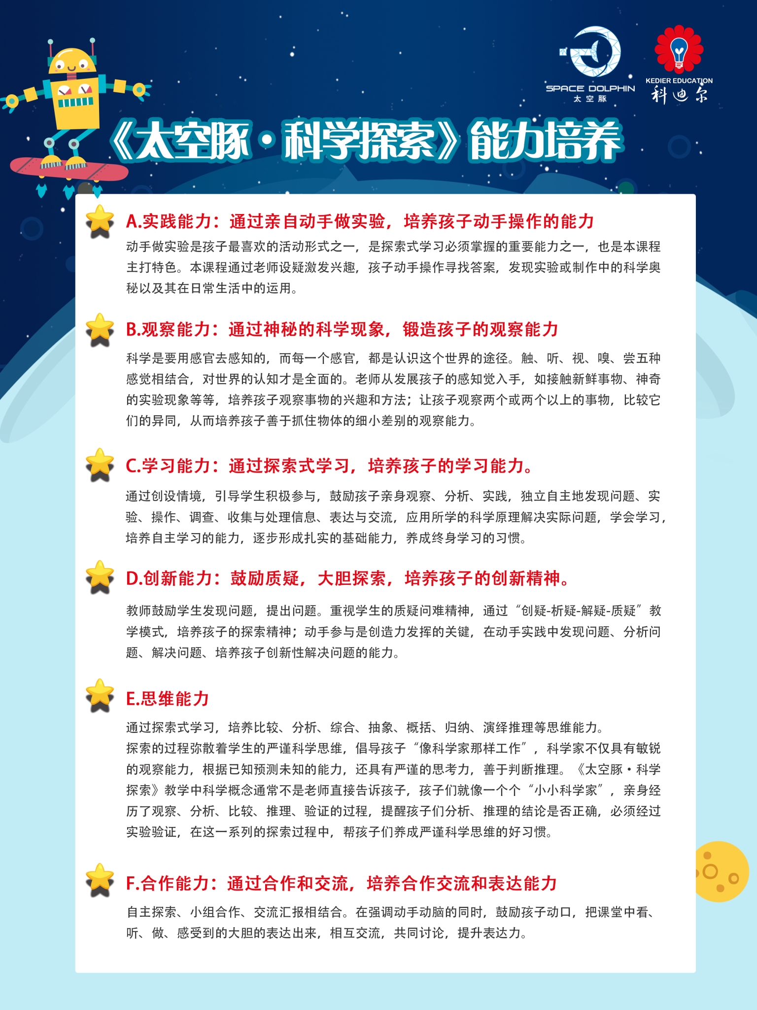 太空豚课程主要培养孩子的六大能力:实践能力、观察能力、学习能力、创新能力、思维能力、合作能力