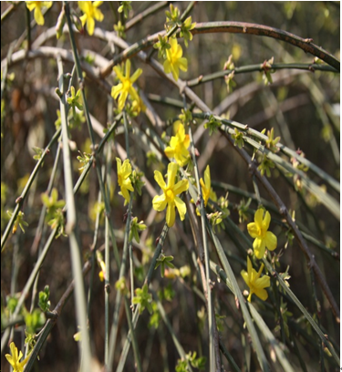迎春柔软绵细的枝条,交错地垂向地面,较为内敛。