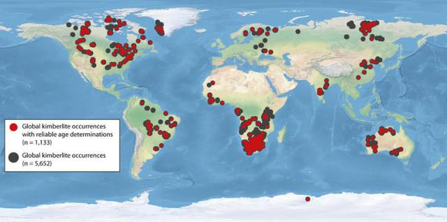 灰绿色点是全世界金伯利岩分布,红色点是其中有可靠定年的金伯利岩产地