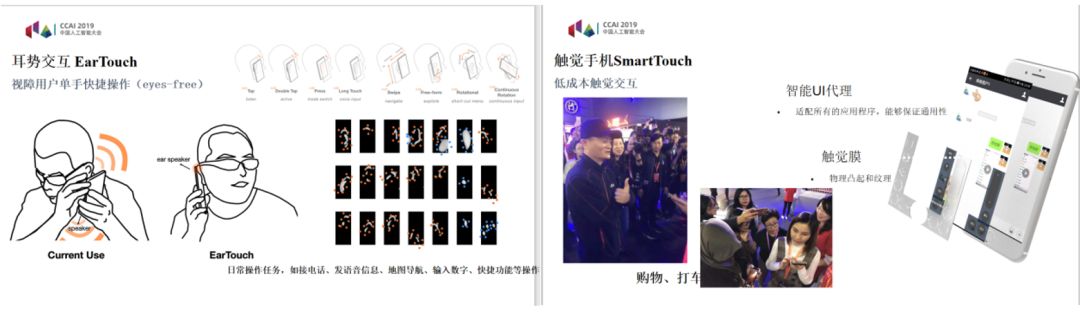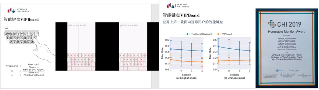 举一个例子,比如目前我们团队研究如何给视觉障碍者进行智能交互。人机交互是关于人和计算机之间有效和自然的信息沟通的技术,涉及到的方面比较多,所谓的智能人机交互,希望在更自然的进行访问、请求、表达,或者是对人无法准确表达的情况下,在不确定或者是模糊的接口上,如何获得精确、准确的访问效果。对于一些残疾人士,他们有一些交互通道可能被关闭了,有没有可能给他们一些替代或者是增强的技术?这里举一个例子视觉无障碍,专门给盲人的智能键盘,盲人用的手机和正常人用的手机是一样的,现在有的读屏软件,可以帮助他们在并行的界面上以串行触摸的方式来接触信息,然而这个效率是极低的,同时现在手机上手指要远大于界面的KEY大小,虽然后台有AI技术的支持以词为单位进行输入校正,但是盲人的界面只能以字母为界面进行校正,我们课题组研制了以人的行为作为支持,进行一定的数据采集和建模,有效的提高了用户输入的准确度,比如大家用华为手机和其他一些类似于搜狗输入法,这里面都包含了我们团队做的一些算法,我们正致力于把这项技术推广到更难的一类人群,就是盲人,这个技术可以很大程度提高输入的准确度,希望很快推向市场给用户使用。
