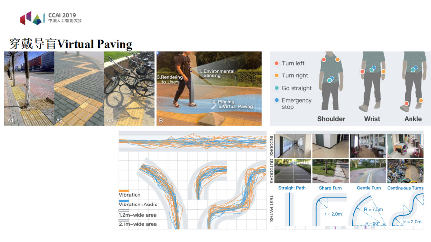 上述图片是我们团队研制到一个面向盲人的可穿戴设备,可以通过振动和提示有效的告诉盲人避障和方向,通过实验可以看出来,这套设备可以完全规避有没有盲道这么一个问题,实验的效果很好,目前得到了盲协和北京市的工业组织的长期支持。