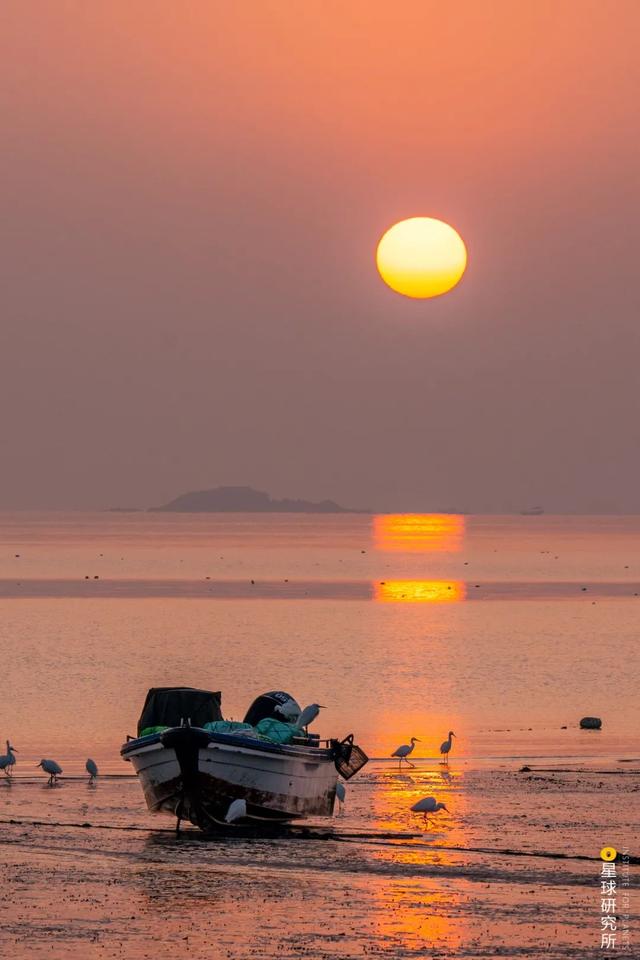 (日出时的厦门海滨,鹭鸟在滩涂上觅食,摄影师@田春雨)