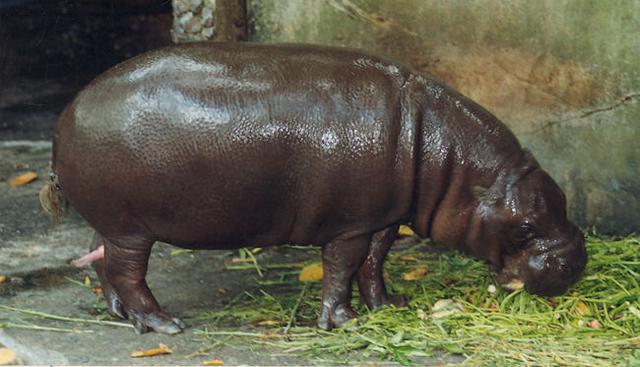 有趣的是,在广州长隆野生动物世界中还展出有一种倭河马,在分类学上与河马同属河马科,它们也是这个科中仅有的两个物种。倭河马的外形酷似河马,但体型比成年河马要小得多,体长为150—185厘米,肩高为70—83厘米,体重只有170一280千克,似乎有点像正在成长的河马“宝宝”,但在很多细节上与河马都有差别。在行为方面,倭河马对水的依赖性不如河马,多在陆上活动,但也善于游泳,喜爱在泥水坑中打滚。与河马不同的是,它属于夜行性动物,也不喜欢群居,但食性却与河马基本一样。▼▼▼