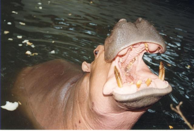 河马常常打哈欠,这实际上是一种威胁的方式,以此来显示那突出的獠牙,作为给对方的警告。搏斗时,它也用锋利的牙齿去刺伤对方,或者试图咬伤对方的腿,因此经常给对方的身体留下伤疤。▼▼▼
