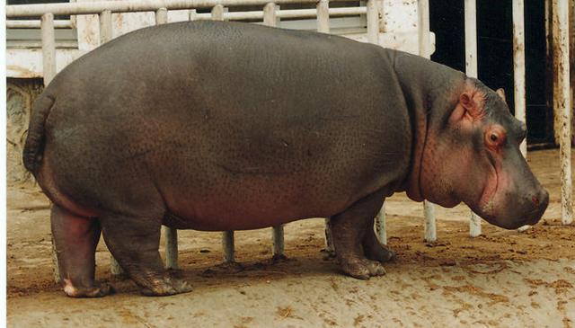 河马是陆地上仅次于大象的第二大哺乳动物。对于这样一个庞然大物,我们首先欣赏的当然它那巨大而显得笨拙的身躯。它的体长足有3.5—4.5厘米,体重更是达到了3000—3500千克!不过,河马长得比较矮,四肢特别短,肩高只有1.40一1.65米,勉强有大象的一半高。在它的前后肢上各有大小几乎相等的4个脚趾,趾尖有蹄,其形状如同扁爪,趾间略微有蹼,显现出一些喜欢在水下活动的特征,不过我们要想观察到它的腿和脚,就只能等到它到陆地上活动的时候。此外,在它的身后还有一条大约50厘米长的尾巴,但由于平时总是紧贴着身体,所以并不引人注目。▼▼▼