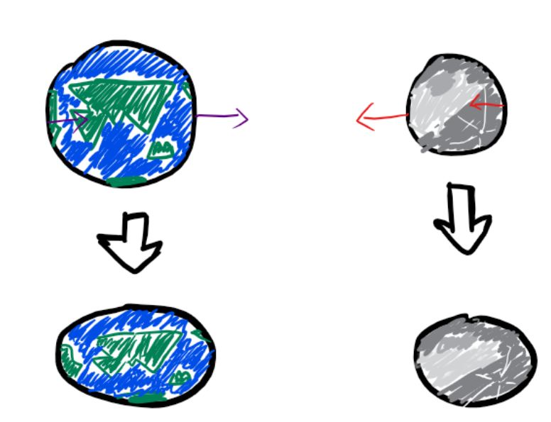 月球竟然不是一个正圆!? 万物之间互相吸引,这种力就是万有引力。物体之间距离越近,引力越大;距离越远,引力越小,这就是万有引力的基本规则。 为了简化问题,首先我们来考虑静止不动的地球和月球。虽然物理课本上把物体当作没有大小的质点来看待,但是它们毕竟还是有大小的。所以,月球表面靠近地球的一侧和远离地球的一侧,由于到地球的距离不同,所以受到来自地球的引力就不一样大。当然,对于地球来说也是这样。所以,这两个球会由于两端受到的力不一样大而被扯成椭圆。 地球和月球。以月球为例,它两侧受到的地球引力不一样大(两条红线不一样长),所以相当于受到一个撕扯力,所以被扯成一个椭圆(事实上没有那么椭,为了说明问题而画得夸张些)。图片来源:作者自制 引力:月球怎么转,还不得听我的! 现在我们知道,月球不是正球,而是一个椭球,这就会出现一些比较有趣的结果。 月球除了进行围绕地球的公转,还要进行自身的自转。起初,这两个转速本身并不一定相同。为了方便讨论,我们假设自转速度是公转速度的1.5倍,也就是说月球绕地球转过了30°时,自己已经自转了45°。这两个角度不同,会导致月面上的物质所受到的地球引力和月球引力不在一条直线上。具体的描述可以参考下面的示意图。 潮汐力对月球自转的影响示意图。图中假设月球自转比公转快,那么地球引力和月球引力的合力就会使得月面上的点受到一个阻碍自转的合力。图片来源:作者自制。 这是一幅从地球北极的上方看过去的俯视图。由于我们现在只考虑月球,所以我们将地球看成一个点。 起初,月球在地球的正右方,前面我们说过,由于潮汐力的存在,月球被扯成一个椭球。接下来,月球将要同时进行自转和公转。我们前面假设过两个速度不同——当月球公转了30°时,自身已经自转了45°。请注意图中自转和公转的方向。此时我们将月球放大,并且考虑月面长轴上的一点。由于月球是一个椭球,所以这点受到的月心引力和地心引力不在一条直线上(月心引力指向月心,而地心引力指向地心,也就是平行于月心和地心的连线。此时读者可以自行想象:如果月球是一个正圆球,这两个力的方向应该是在同一条直线上)。这两个力的合力也就不再沿着地月连线,而是朝向一个阻碍月球自转的方向(图中可以看出,合力的方向与红色箭头所示的自转方向相对抗)。 请注意(敲黑板),前面我们假设的情形是月球自转比公转快(在一段时间内,自转45°而公转30°)。用类似的方法可以推出,如果反过来(自转比公转慢),那么这个合力就会与自转的方向相顺应,也就是说促进月球自转(作者内心独白:读者那么聪明肯定能自己推导的,所以不用写了)。也就是说,如果自转比公转快,那么合力会减速自转;如果自转比公转慢,那么合力会加速自转。 快了就会被减速,慢了就会被加速,那么经过一段时间之后,月亮会稳定在一个什么状态呢?当然就是——自转和公转速度一样快了。自转和公转一样快意味着什么呢?这意味着在相等时间内,月球自转扫过的角度和公转扫过的角度一样大。所以,月球也就只有一个面朝着地球了。下图就描绘了这个情形。 月球自转和公转一样快的结果就是月球只有一面向着地球。图中灰色的角度是公转扫过的角度,粉色表示的是自转扫过的角度。如果这两个角度相等,那么就导致月球只有绿点的一面能够朝向地球。图片来源:作者自制。 如果地球被月球锁定…… 综上所述,月亮只有一面朝向地球的原因有两个:第一个是因为潮汐力的作用使得月球是椭球,第二个就是月球自转和公转的相互作用使得自转速度向公转速度靠拢。最终的结果是自转速度和公转速度相同,这就是潮汐锁定现象。 不过虽然月球只有一面朝向地球,但是我们能观察到的月面要比一半多一些,大概占月面总面积的60%。这主要是月球自转轴和公转平面的夹角以及公转轨道的离心率造成的。另外,由于地球比月球大,所以在月出和月落时,可以因视角的问题分别多看到一点背面的部分。 此时我们回过头来考虑地球,地球也是因为受到月亮施加的潮汐力而成为椭球,而且也是在自转的同时围绕着月亮转(运动的相对性)。所以,地球的自转速度(24小时一圈)也在向着围绕月球的速度(30天一圈)靠拢。但是,由于月球相对于地球太小了,所以对地球自转的拉扯非常有限,在可以预见的未来并不会被月球锁定。 如果地球也被月球锁定的话,那么地月系统就解锁了一项新成就:双向锁定,两者都只能有一面朝向彼此。可以想象一下花样滑冰比赛中两位选手相向旋转的场景,那就是双向锁定之后地球和月亮之间的舞蹈。在太阳系中,已经解锁这项成就的是冥王星和它的伴侣卡戎,因为它们离得比较近而且质量差距也不太大。那么地月系统有没有机会最终牵手成功呢? 双向锁定。(图片来源:http://www.sohu.com/a/274273277_99985320.shtml) 虽然月球对地球的影响不大,但是我们还要考虑日地系统。地球自转的速度(24小时一圈)比它绕太阳公转的速度(约365天也就是8760小时一圈)快很多。这意味着地球的自转速度也会因此而逐渐减速。研究表明,在太阳和月球的双减速作用下,每过一个世纪,地球上的一天时长就会增加约1.7毫秒,因为6亿多年前的地质数据表明,当时地球上一天仅有21小时左右,相应地,一年有400多天。按照这个速度发展下去,就算到了太阳毁