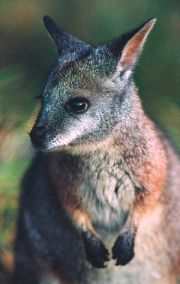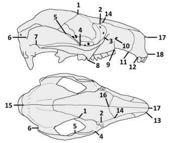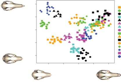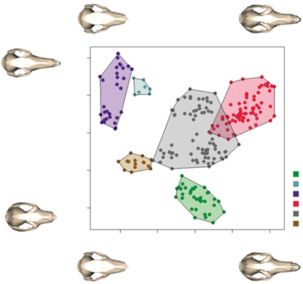 袋鼠Roger,袋鼠界的巨石强森,没事喜欢徒手揉铁桶的世界性网红。(图片来源:https://www.abc.net.au/news/2018-12-10/roger-the-ripped-kangaroo-dies/10599312) 可能Roger的脸是大家最为熟悉的一种袋鼠脸。 人类有长脸、圆脸、方脸、鹅蛋脸、鞋拔子脸,那么袋鼠是不是就这一种脸型呢? 笔者常常觉得自己的脸这么圆一定是因为自己太机智(这应该是全文唯一一句没有科学依据的话,但不接受反驳,且强行过渡到本文主题),如果袋鼠的脸型也不止一种,那么不同脸型又是受什么影响的呢? 经典理论认为,哺乳动物的脸长受到体型大小的影响即异速生长现象(Allometry)。随着体型的增大,脸长会出现不等比例地增大;但从生物力学角度的研究发现,食物的软硬可能也会影响到哺乳动物的脸长。 近日,英国著名学术期刊《Proceedings of the Royal Society B》发表了一篇名为《The biomechanics of foraging determines face length among kangaroos and their relatives》的研究论文。 文中,澳大利亚新英格兰大学的Rex Mitchell等研究者对馆藏于澳大利亚博物馆、昆士兰博物馆和新英格兰大学自然历史博物馆的16种袋鼠、236件标本进行CT扫描重建后,进行了三维几何形态测量学和生物力学分析,尝试判断袋鼠脸长的差异主要是源于异速生长还是食性的区别。 研究结果显示,异速生长在某些袋鼠种类中的确对头骨形态具有一定的影响,而取食习性则对于各个类群的脸长有更深刻广泛的影响。简单来说,一切都是因为吃啊。 重新认识袋鼠: 不是所有的袋鼠都是澳洲拳王 首先,让我们来重新认识一下袋鼠。 其实,并不是所有的袋鼠,都叫Kangaroo。也不是所有的袋鼠,都是澳洲拳王。 袋鼠亚目(Macropodiformes)是哺乳动物中双门齿兽目下的成员,包括袋鼠科(Macropodidae)、鼠袋鼠科(Potoroidae)和麝袋鼠科(Hypsiprymnodontidae)。 Kangaroo往往指体型较大的袋鼠,比如红大袋鼠Roger,Wallaby指一些体型很小的属种,Wallaroo则是二者之间的体型中等者。它们代表了绝大多数最为人所熟识的袋鼠科成员。 尤金袋鼠(Macropus eugenii),袋鼠一族中的小可爱 (图片来源:Dr. Gerhard Koertner, University of New England.原创) 由此可见,袋鼠们的体型差别其实非常大,最大的可重达90公斤,最小的不足1公斤。同样,不同的袋鼠之间食性差别也很大。此项最新研究中的16种袋鼠包括了最小的种类(麝袋鼠)到最大的种类(红大袋鼠)等各种体型。这些不同的袋鼠还可以按食性分为:吃草、吃树叶及嫩枝、吃植物根系、吃水果、吃蘑菇(说实话我总觉得袋鼠吃蘑菇画风有点清奇…)以及杂食。 麝袋鼠(Hypsiprymnodon moschatus),仅生活在澳洲东北部的热带雨林中,是世界上体型最小的袋鼠(图片来源:http://www.iltaw.com/animal/1118) 对于植食性哺乳动物而言,体型更小的物种会倾向于选取数目不大但营养丰富的食物,比如果实、真菌、昆虫、植物的根等。这些食物在物理性质上差异很大,比如根就会非常硬。体型较大的动物则会倾向于选取营养不那么丰富但容易大量获取的食物,比如草,树叶,嫩枝等,大致可以分为两种:一种是吃草(单子叶植物),另一种是吃叶子及嫩枝(双子叶植物)。这些食物在物理性质上也有所差异,比如含有木质的嫩枝比草更硬一些。 相比于吃草动物,吃嫩枝的哺乳动物一般具有更短的面部,因此曾有推测可能更短的吻部(脸长)有利于取食更硬的食物。 面对五花八门的体型和食性组合,如何抽丝剥茧,使用先进的计算机模拟手段,研究出食性对形态真正的影响呢?此项最新研究中借助了三维几何形态测量和有限元分析这两大定量分析的法宝。 三维几何形态测量 首先,研究者需要定义脸的长短。 怎么着算脸长,怎么着算脸短呢? 图片来源:微博@树上的肥猫哇 研究者在袋鼠们的三维头骨模型上定出了32个同源的标识点,使得这些点在空间上的分布就能够定量地代表各个标本的形状。 将脸的长短定义为吻部与颧弓所占的比例。对照着下图看,颧弓大约是点7到点3,吻部相当于点3到点17分。 用于进行形态分析的标识点在头骨上的位置示意图 (图片来源:Mitchell et al., 2018.) 通过将它们的空间坐标进行一系列迷之变换神之操作,在形态空间中同时呈现了两百多个袋鼠脑袋的形状,通过抽出各个主成分,我们就可以定量地看到各个标本之间的形态差异了。 再经过一系统迷之操作,通过对原有模型的三维变形,我们可以模拟出每一种形态差异的极端情况并将其可视化。 于是,从下图横纵轴两侧的模拟极值状态可以看出,下图中的横轴(第一主成分)代表随着体型的变大(从左往右),头骨明显显示出脑颅缩小、颧弓变宽、门齿向前延伸的变化。纵轴(第二主成分)上的值低意味着脸比较短,值高则意味着脸比较长。 (图片来源:Mitchell et al., 2018.) 可能上图中,根据属种进行分组看起来比较晕,下图中,根据食性进行分组后,有没有感觉世界豁然开朗! 可以比较明显得看出来,吃嫩枝的脸最短,吃根的脸比较短,吃草的相对较长,吃水果和蘑菇的最长,杂食的夹在中间。 主成分分析结果图2。不同的颜色代表不同的食性:红色代表吃草,绿色代表吃嫩枝,黄色代表吃根,蓝色代表吃果实,紫色代表吃蘑菇,灰色代表杂食 (图片来源:Mitchell et al., 2018.) 有限元分析 与此同时,研究者对16种袋鼠建立了有限元分析的模型。为了预测咬合力和量化比较每种头骨形态的力学效率(Mechanical efficiency),在模型上还恢复了七组用于咀嚼的肌肉。 那么这些肌肉恢