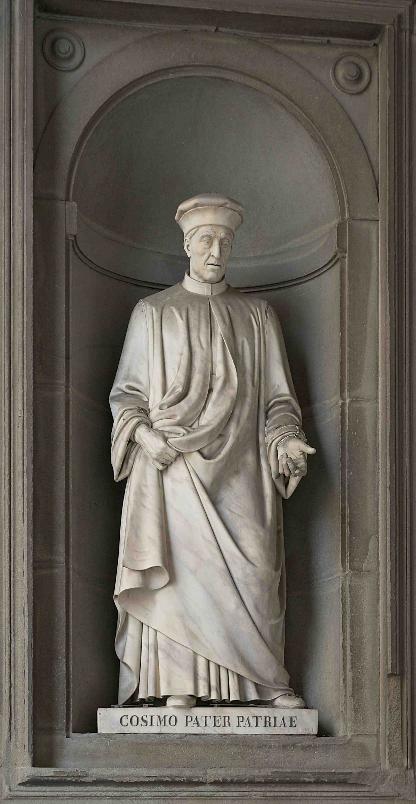 图9a-3 路易吉·梅吉(Luigi Magi,1804年-1871年),建国之父柯西莫,大理石雕塑,现陈列于乌菲齐正门左侧丨图片来源:维基百科,摄影师Jebulon