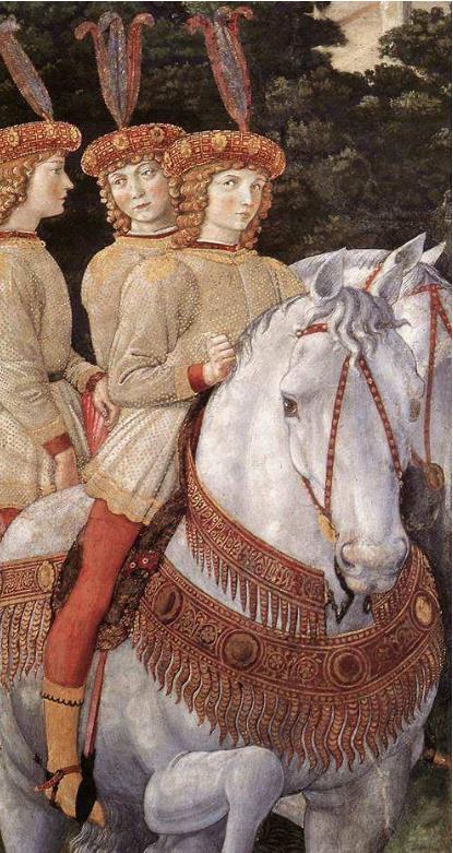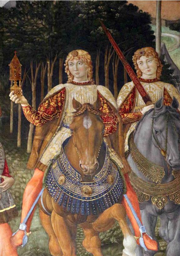 我们最后以画中右边携带礼物的两位年轻骑士的形象来结束本节,我们不知他们是否是真实存在的人物,在画中他们是整个年轻王者朝圣队列的开道者(图11)。