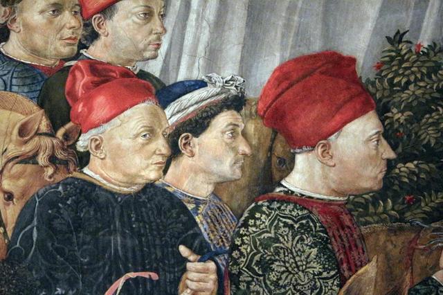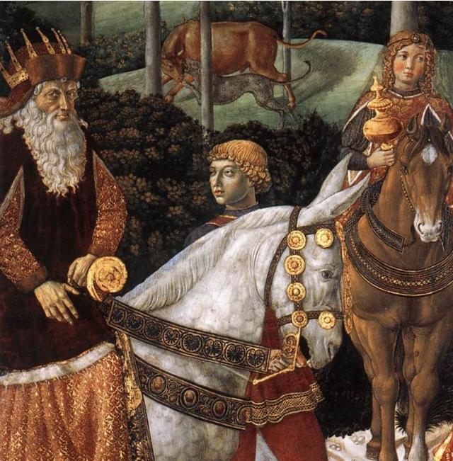 图10展示的是年轻王子队列这幅画的整个右下角,它实际上反映的是老柯西莫本人以及他领导下的佛罗伦萨所取得的成就。虽然自1434年后,柯西莫成为了佛罗伦萨事实上无可争议的城市领袖,但他只在1434年、1438年与1445年时三次被选为共和国最高行政首长正义旗手,与同时期佛罗伦萨中一些有实力的人物并无区别。与这些佛罗伦萨权势人物不同的是,柯西莫具有超凡的国际影响力,意大利各强邦的领袖、神圣罗马帝国皇帝与法兰西国王等都会听取甚至遵从柯西莫的意见。细心的人会注意到老柯西莫的坐骑是一头漂亮的驴子,它应该是老柯西莫作为和平使者的象征,正因具有超凡的国际影响力,老柯西莫在1450年代中期促成了意大利半岛各强邦长达50多年的和平,史称洛迪和平(Pace di Lodi),为豪华者洛伦佐统治下佛罗伦萨黄金时代的到来奠定了基础。