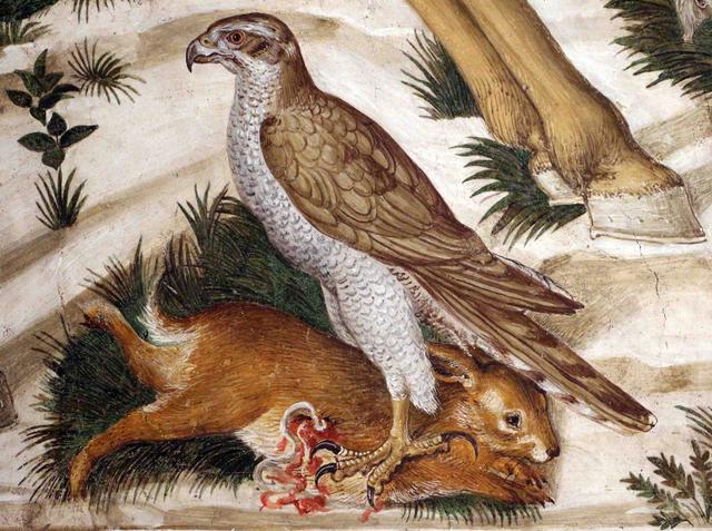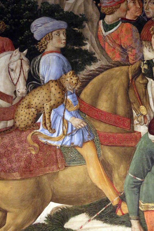 完全结束本节之前,在此再指出一件有趣的事情,在图12中年轻骑士的坐骑后蹄下,细心的人会看到一只苍鹰(图17),人们认为它有可能是支持教皇的佛罗伦萨圭尔夫党的象征;这一动物造型的来源可能是美第齐家族所用的一个印章,其中有苍鹰抓握带钻石戒指的形象并写着拉丁语SEMPER(意为“永恒”)。在整个系列壁画中,我们会看到许多奇珍异兽(如图18),虽然它们被巧妙地嵌入在与之相配的情景之中,但许多动物在当时应该都有特殊的意涵,今天它们是某些艺术史学家研究的课题。