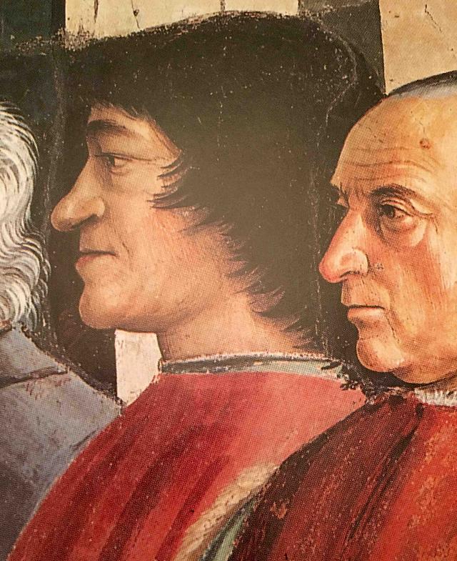 图8b-1 吉兰达约,豪华者洛伦佐·德·美第齐(画中左边人物),1485年绘制,现陈列于佛罗伦萨天主圣三圣殿中萨塞蒂小礼拜堂丨图片来源:维基百科