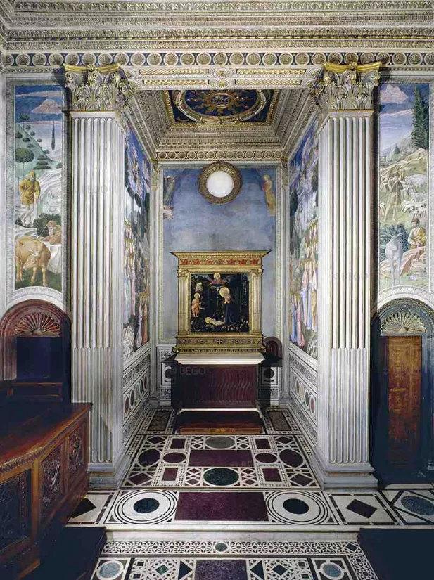 1442年罗马教皇马丁五世(Pope Martin V)颁布敕令,准许美第奇家族在其居所内建造一个带祭坛画的家族礼拜堂。正因有此敕令,建筑师米开罗佐(Michelozzo di Bartolomeo)于1446-1449年间设计并建设美第齐宫时,在宫内第二层最私密安全的地方打造了一个“凸”形小礼拜堂。美第齐家族邀请画家贝诺佐·戈佐利(Benozzo Gozzoli,约1421年–1497年)为小礼拜堂绘制壁画,与其一起工作的还有助手画家乔瓦尼·迪·穆杰罗(Giovanni di Mugello)。