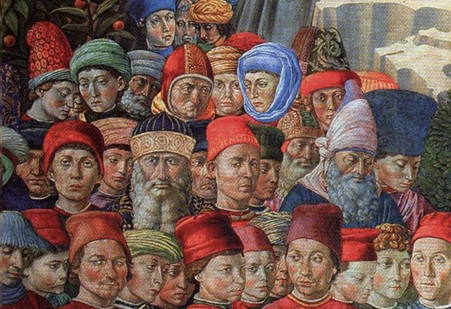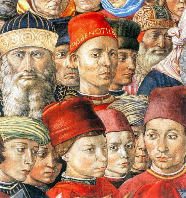 在图16中我们可以看到画家本诺佐·戈佐利本人,他两次出现在众人中,一次带着蓝白色相间的帽子,另一次是在稍微上面一些,带着黑颜色的宽沿帽子。