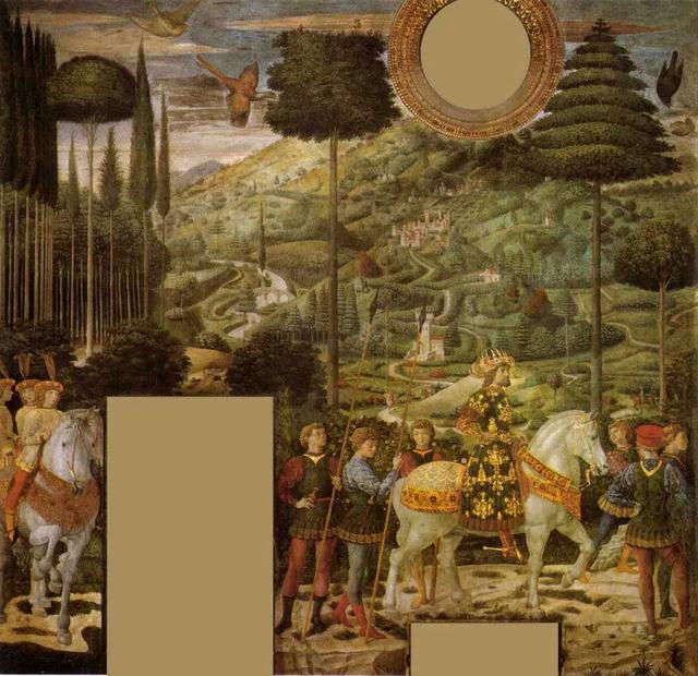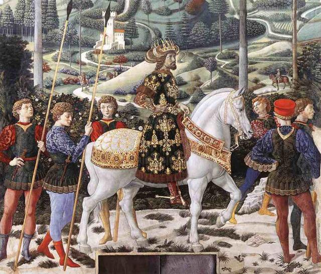 图1 美第齐宫小礼拜堂大厅东墙壁画:年轻国王与其朝圣队列,湿壁画,1459-1460年绘制,现陈列于佛罗伦萨美第齐-里卡尔迪宫内小礼拜堂丨图片来源:维基百科