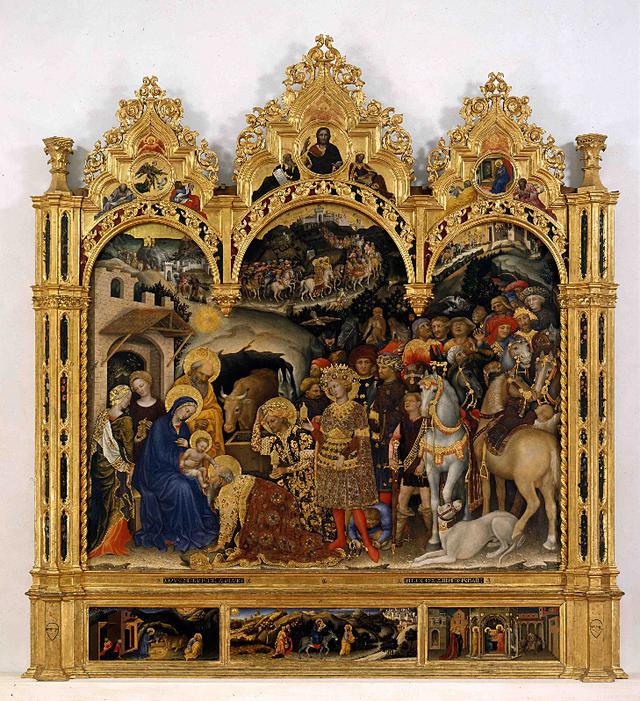 图7 法布里亚诺,《三王朝拜》,木板蛋彩画,1423年绘制,带框高301.5厘米,宽283厘米,现陈列于意大利佛罗伦萨乌菲齐博物馆丨图片来源:维基百科