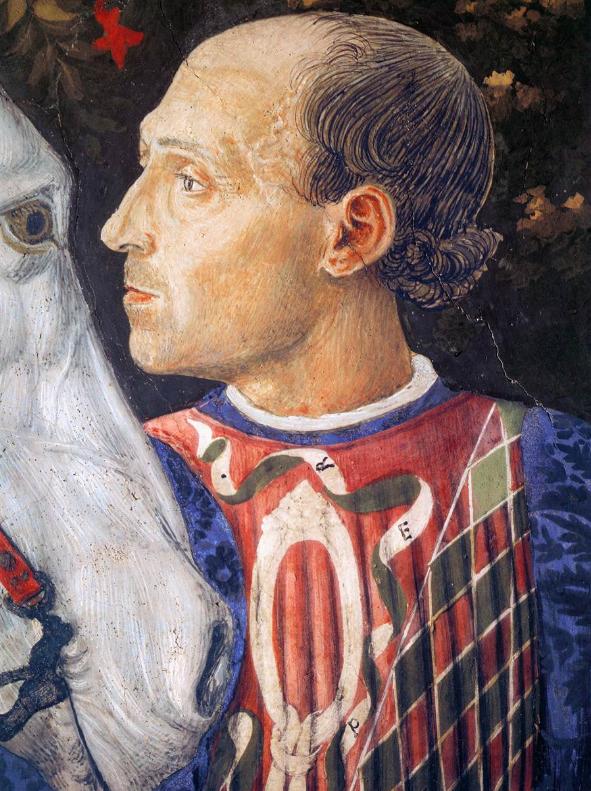 图9b是图1年轻王子队列这幅画的最左下角部分,其中左边人物为雇佣军首领西吉斯蒙铎·潘多尔佛·马拉泰斯塔(Sigismondo Pandolfo Malatesta,1417年–1468年),北部意大利艾米利亚-罗马涅(Emilia-Romagna)地区的雇佣军将领,里米尼(Rimini)、法诺(Fano)和切塞纳(Cesena)等城市的领主;右边人物为雇佣军首领加莱亚佐·马里亚·斯伏查(Galeazzo Maria Sforza, 1444年-1476年,在1466-1476年间任米兰公爵)。作为意大利最重要的雇佣军将领与独霸一方的领袖,他们都是美第齐家族的强有力支持者。更为重要的一点是,他们在思想与生活方式等各方面都深受老柯西莫的影响,都喜欢并热衷于赞助新兴艺术。毫无疑问,他们是老柯西莫构造的意大利势力均衡和平体系的重要支持者。