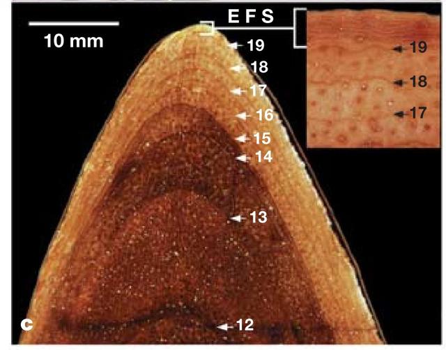 雷克斯暴龙骨组织切片当中的“生长标记”,这种标记被称为“生长停滞线”。图上标的数字就是年龄。(图片来源:Erickson et al., 2004)