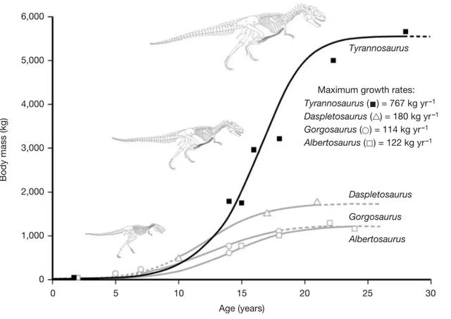结合“生长标记”的年龄信息,和体重估计信息,就可以得到恐龙的生长曲线了。如图是Erickson 构建的关于几种暴龙类恐龙的生长曲线,由此可见雷克斯暴龙长得比其他恐龙大的主要原因是快速生长期长得非常快。