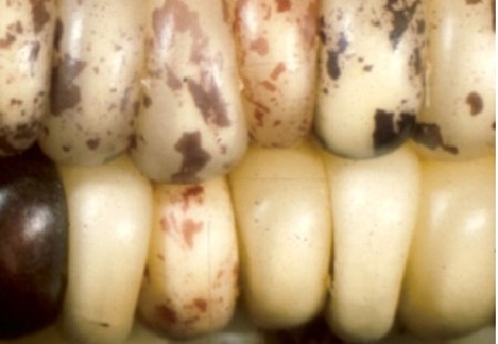 从1932年开始,麦克林托克就在印度彩色玉米中观察到了玉米籽粒与叶片的色斑无法稳定遗传的现象,而且色斑的大小和出现的时间也是各有不同。为了找到这个问题的答案,麦克林托克培育出带有某条特定染色体的玉米植物,该染色体的存在会导致隐性棕色表型(bz基因),而该玉米原本具有的染色体编码白色显性表型(无色,C基因)。根据正常的遗传理论,后代应该显示出全白色的籽粒,但是部分籽粒显现出了白色带棕色斑点的性状。