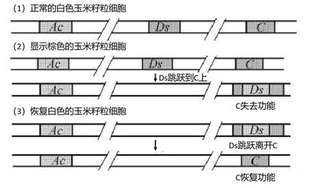 麦克林托克将意外的变化归因于染色体断裂,使染色体丢失一个基因,她称这种现象为解离,发生在她称为Ds的染色体基因座上,此外,她认为这种断裂是由于“跳跃”活化剂(Ac)引起的,Ac促使Ds“跳跃”,Ds的移动可能导致被插入基因C产生突变而不能正常行使功能,则隐性基因得到优势,将显示为棕色,而Ac控制Ds从突变的C基因处“跳走”又可以恢复C基因的功能,显示白色,所以,玉米籽粒白色背景上棕色斑点的数量取决于籽粒发育期间基因“跳跃”的时间。