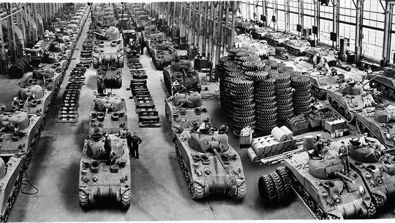 1942年到1945年,战时生产委员会指挥生产了价值1,850亿美元的武器装备和用品。二战时的1850亿美元,等于2019年的837790.1亿美元。平均每年为209447.525亿美元。