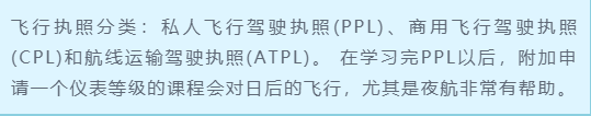 飞行执照分类:私人飞行驾驶执照(PPL)、商用飞行驾驶执照(CPL)和航线运输驾驶执照(ATPL)。 在学习完PPL以后,附加申请一个仪表等级的课程会对日后的飞行,尤其是夜航非常有帮助。