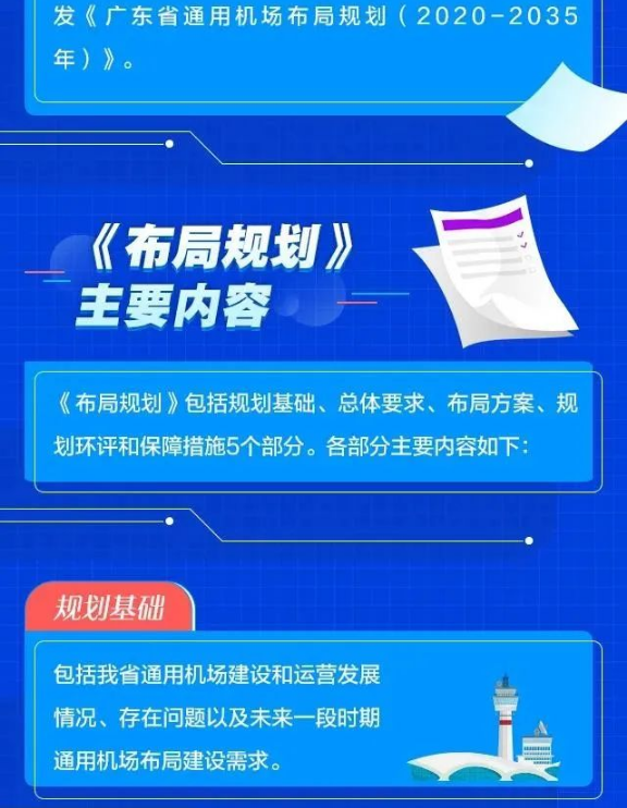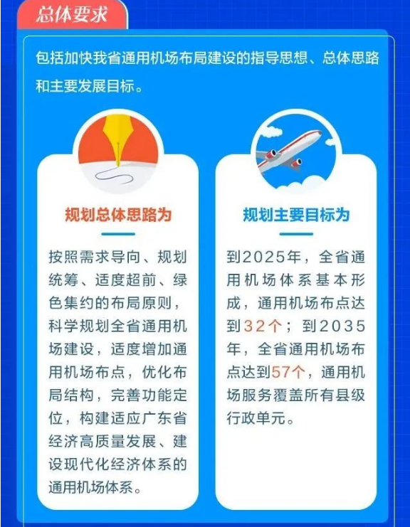 近日,广东省正式印发《广东省通用机场布局规划 (2020-2035年)》(下称《规划》),提出到2025年全省通用机场体系基本形成,通用机场布点达到32个,机场密度达到每万平方公里1.8个。到2035年全省通用机场体系进一步完善,通用机场布点达到57个,机场密度达到每万平方公里3.2个,通用机场服务覆盖所有县级行政单元,机场密度和通用航空运营服务能力接近发达国家(地区)水平。综合来看,共规划57个通用机场布点,规划期新增通用机场布点48个,并将由各地级以上市发展改革部门牵头,构建以公共服务为主体、覆盖全省各市县的直升机起降点布局。