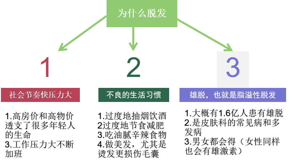 过去,脱发主要出现在中老年群体中,然而近些年来,脱发呈现了明显的低龄化趋势,脱发人群中,80后和90后竟占据了70%以上!要知道这些人可是当今社会的主力工作人员,很多人正在打拼之中,弱冠之年真的“无冠”,而立之年未曾立,却先失去了发髻。
