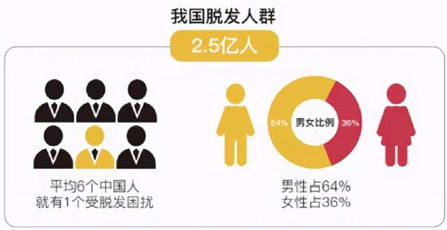 事实上,脱发在当前已经成为一个非常值得普遍的现象,根据《中国脱发人群调查》,我国脱发的人群已经高达2.5亿,其中女性占36%,男性高达64%。