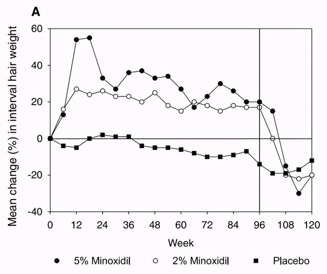 相比于对照组(placebo),米诺地尔能够明显改善发量。
