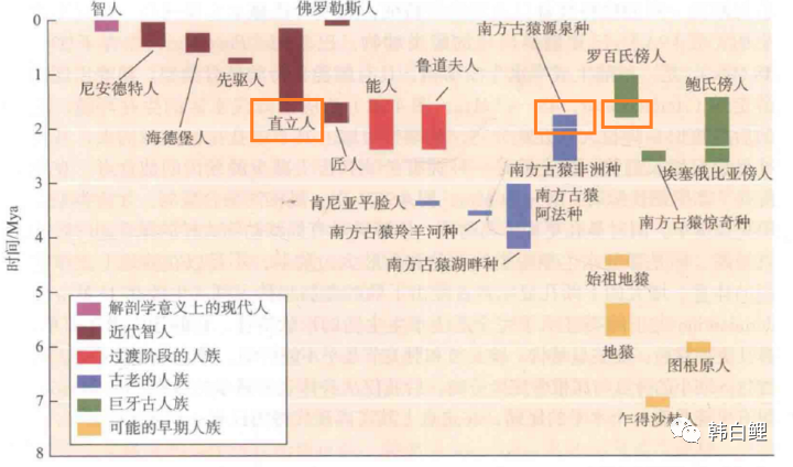 人类进化图谱:各种人族生活的时间段 (图源《生物进化 第3版_(美)弗图摩著》)