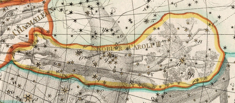 (此前南船座的形象因为没有船首部分,需要一些特殊的方法来掩盖船头部分的缺失。通常的处理方式是让船首消失在薄雾中,或是将其遮挡在礁石后面。哈雷将南船座的部分恒星重新定义为查尔斯的橡树座,但仍然需要用云层来掩饰南船座的船头部分。)