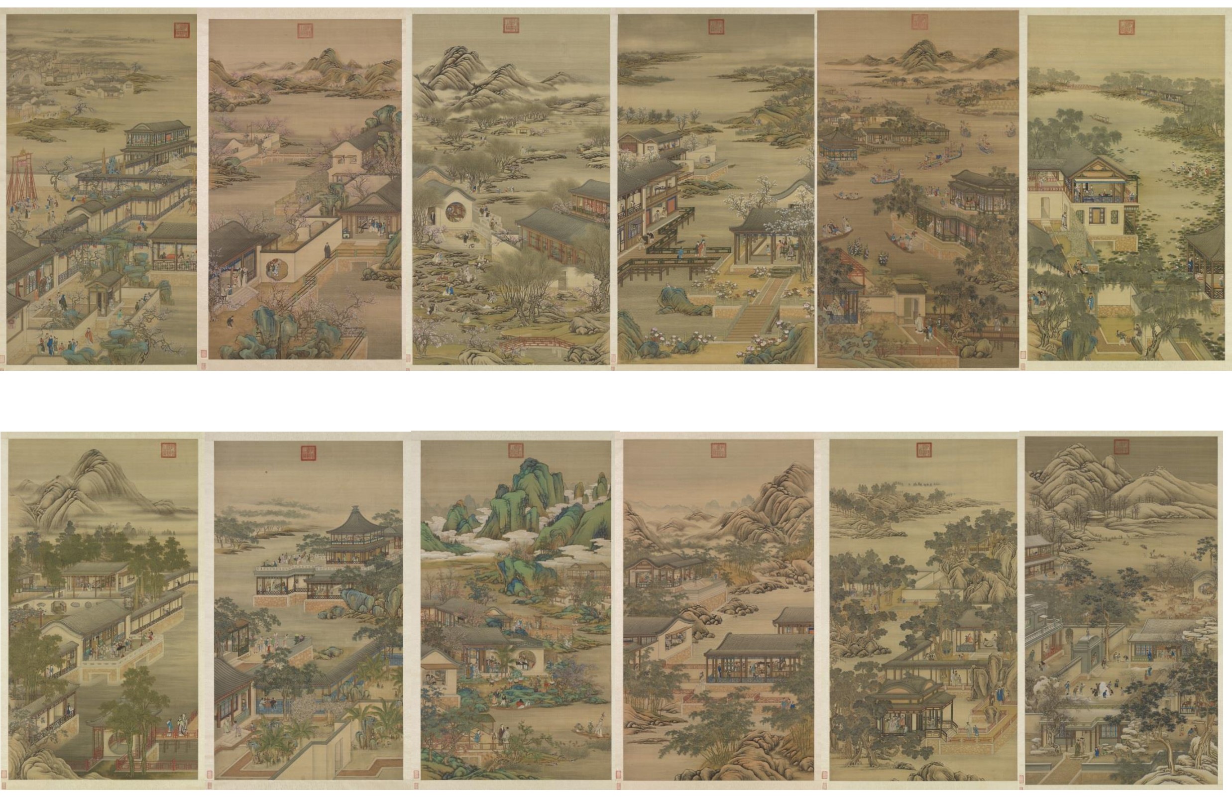 (画中描绘了各月的岁时活动,如正月赏花灯、五月赛龙舟、七月乞巧、八月赏月、九月登高赏菊、十二月滑冰等。)