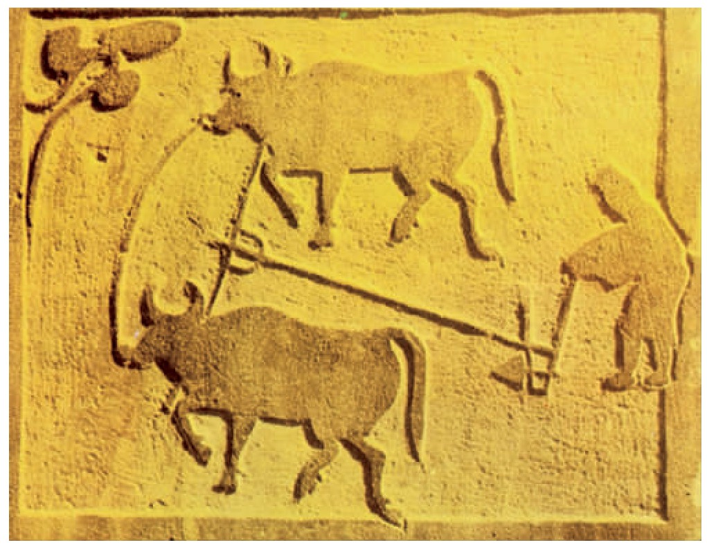 山东省金乡县城东郊香城堌堆发现的石椁墓石椁画像石,为“二牛三人”抬杠式牛耕画像。“二牛三人”是最早的牛耕形式,东汉时有了很大的发展,驭牛人员从三人减少至一人,且犁地主要由一人完成,另一人则起辅助作用,劳动力节省了三分之二。