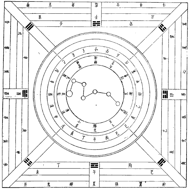 栻盘由圆形天盘和方形地盘组成,形制象征天圆地方。早期栻盘多为木质,“枫木为天,枣心为地”,天盘与地盘之间由转轴连接,使用时天盘转动,因此被称为“旋式”。从甘肃武威、安徽阜阳、朝鲜乐浪古墓等出土的栻盘来看,天盘外圈有十二月神与二十八宿,内圈为北斗七星连珠式样,斗星之间有细线相连,其中第五星为转轴,斗柄可随天盘旋转指向地盘各种卦象,用于占卜。