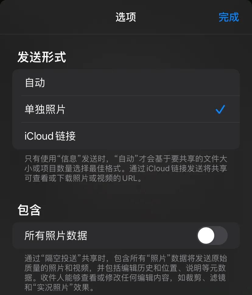 80 iPhone手机发送照片给好友时,一定要点击照片下方的“选项”,关闭“所有照片数据”按钮,选择“单独照片”发送。