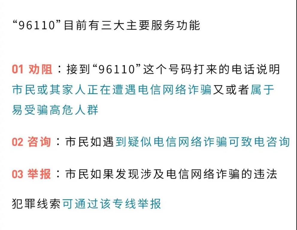 76 如果你的手机接到“96110”这个号码的来电,不要挂断。这是全国统一的预警劝阻咨询电话: