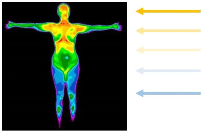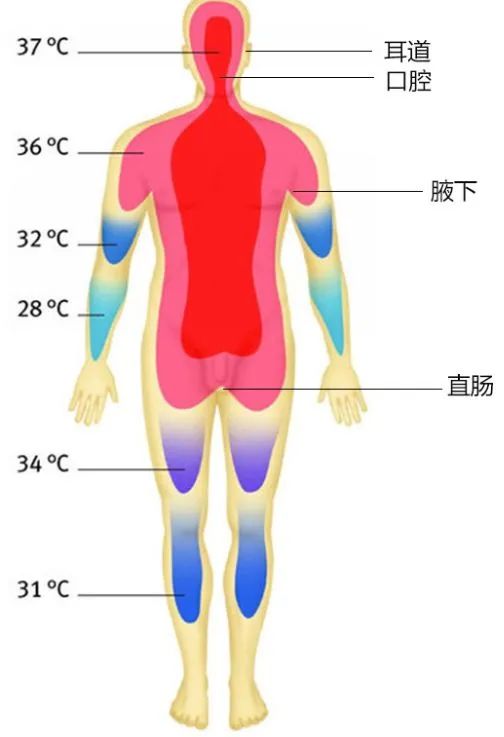 除了上面时间和年龄段对人群温度的影响,对于同一个人来说,不同身体部位温度也存在差异,比如下图是一个人体不同部位的体温示意图。
