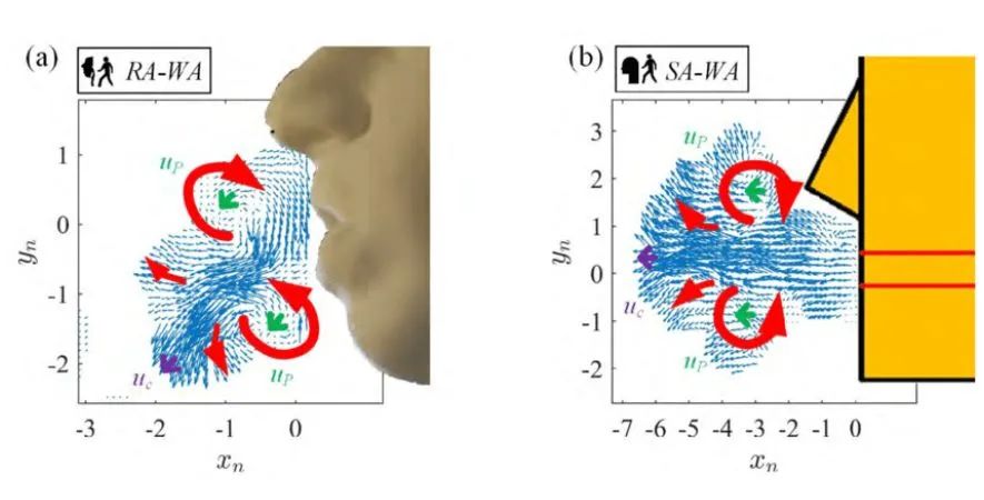 而这一过程,伴随着呼吸道的气流变化,其实是主要局限在头部。而这个气流也并非简单的气流,而是形成了类似湍流的情形,如下图所示,是一个我们正常呼吸的气流图和模型图
