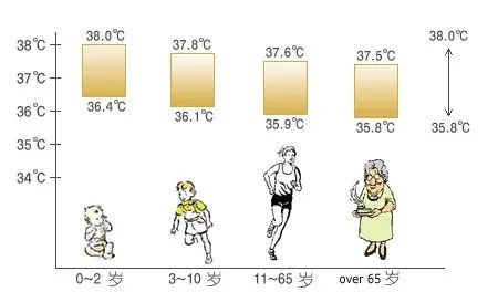 比如上图是不同年龄段的体温,我们可以看到老年人代谢缓慢,体温是最低的,在35.8-37.5之间。而婴幼儿体温是最高的,在36.4-38℃左右,其实这不仅和代谢有关,还和婴幼儿的免疫力有关,毕竟对于免疫在逐步建立中的婴幼儿来说,较高的体温是有助于体内免疫力增强(当然不是高烧哈),更别提婴幼儿本身较高的体脂率。因此很多时候,家长会觉得婴幼儿和成人一样怕冷,其实他们比我们更耐寒。