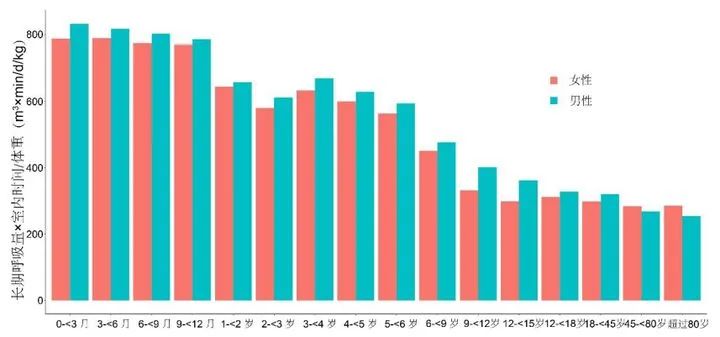 尤其是婴幼儿,下表为不同年龄段长期呼吸量和体重推荐值的比值,可以看到,婴幼儿的值是最高的,这意味着他们的相对呼吸量非常大