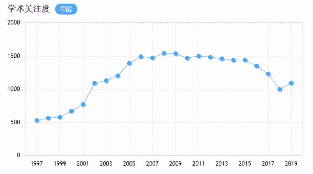而从国内对甲醛的学术关注来看,我们也可以得出类似的结论。以“甲醛味”关键词进行检索,可以发现,在90年代,人们对甲醛关注较低,发文量在500这个层次,而到了2000年后,这个数字上升到了1000并在相当长时间内保持在1500这个数量。