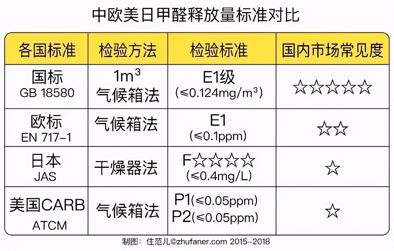 而面对不同的国际标准的时候,原则上,肯定是标准越高越好。以甲醛为例,如上图所示,是不同地区对甲醛释放量的检测标准,那么理论上,我们应该选择最高的标准。