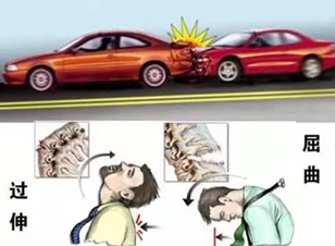 颈椎过伸伤顾名思义就是颈椎在过伸状态下引起的损伤,常见于车辆行驶中急踩刹车导致头面部撞击方向盘、追尾导致颈部向后过伸、各类意外跌倒后头面部撞击地面导致颈部过伸。因此很多人会合并头面部皮肤擦伤。在追尾等情况下受伤时,颈部在经历短暂的后伸后会再次改为屈曲位,就称为挥鞭伤,顾名思义,就是颈椎像鞭子挥出一样甩动,从而造成损伤。(如下图所示)
