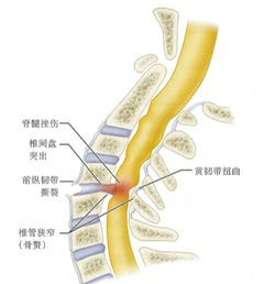 颈椎过伸时脊髓被前方突出的椎间盘和后方的黄韧带“前后夹击”导致损伤